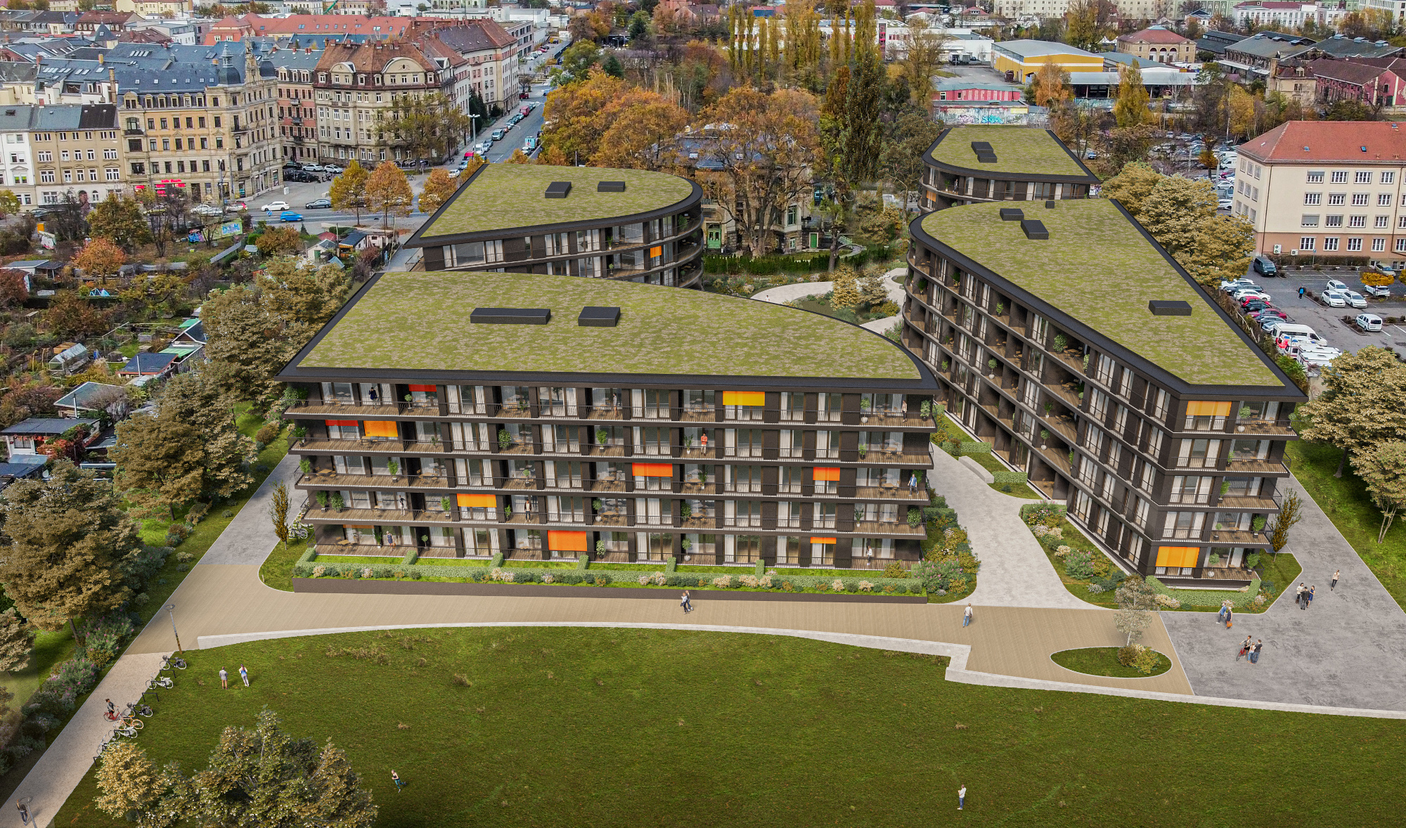 Zwischen den Wohngebäuden und dem Elbufer entsteht eine breite, landschaftlich gestaltete Grünfläche, die gleichzeitig als Retentionsfläche dient. Auch ein Spielplatz ist dort vorgesehen. Erschlossen wird das Areal von der Leipziger Straße aus. Zwischen Puschkinplatz und Elberadweg wird eine neue Verbindung für Fußgänger und Radfahrer geschaffen. Auf der anderen Seite führt eine Stichstraße, die auch als Feuerwehrzufahrt dient, in das neue Wohngebiet.