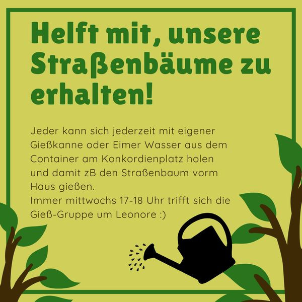 „Liebe Nachbarn! Unsere Straßenbäume sind Helden, die das Stadtklima verbessern, Feinstaub binden und Schatten spenden. Was wäre unsere Straße, unser Zuhause ohne diese Bäume… Momentan sind sie durch die Trockenheit sehr strapaziert und können unsere Hilfe gebrauchen.