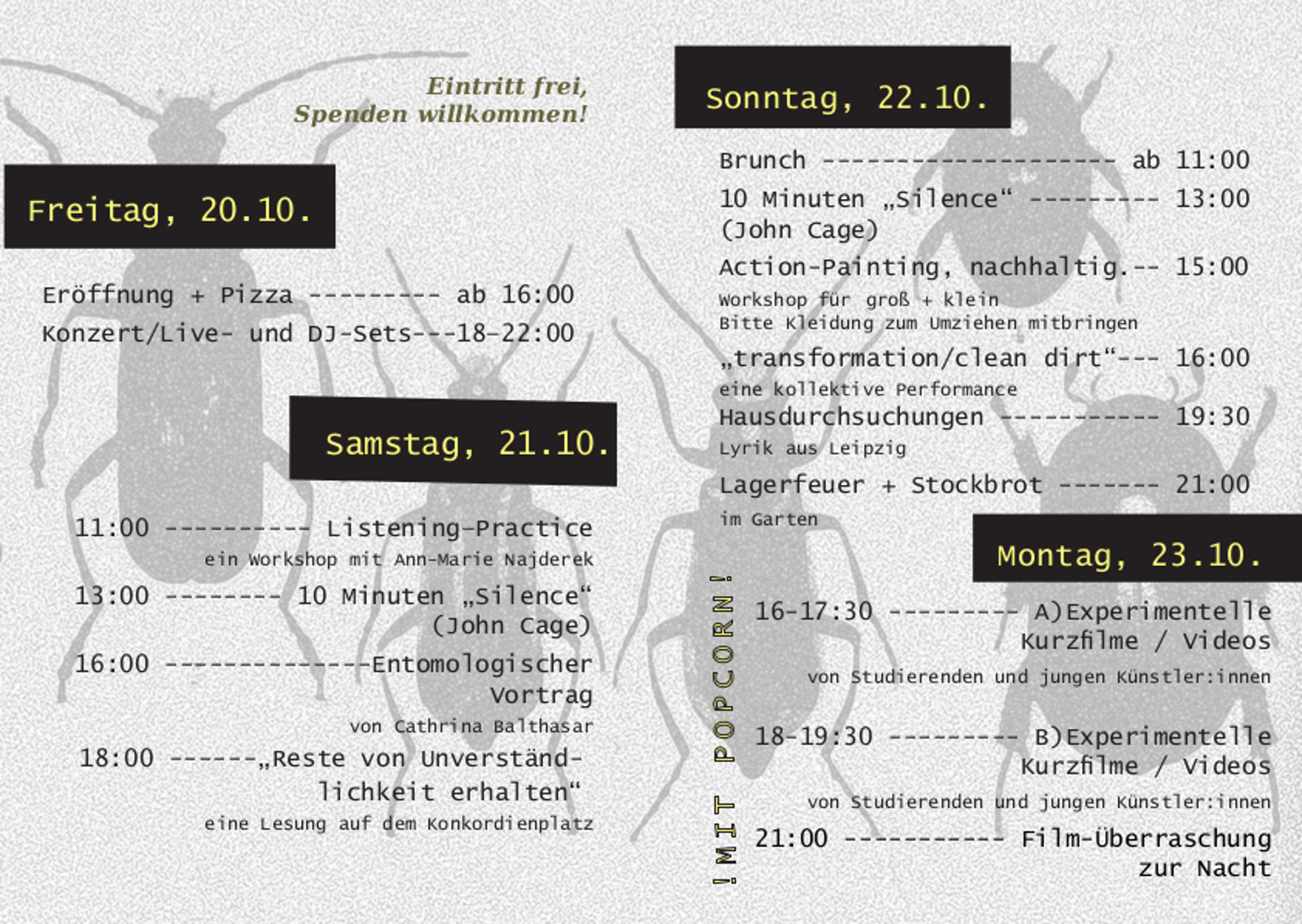 Klausefest? Käferklause? Vier Tage feiern? „Ja, das sind wir und wir laden alle Anwohnerinnen und Anwohner ein, uns kennenzulernen“, erzählt Maria Exposito. Sie studiert an der Hochschule für Bildende Künste und gehört zu einem neunköpfigen Team, das die Geschäftsräume in der Oschatzer Straße 20 gemietet und in „Käferklause“ umgetauft hat. Bereits im Juli hat es hier ein erstes Event gegeben. Während der Semesterferien ruhten dann jedoch die Aktivitäten. Jetzt wollen sich die Studentinnen und Studenten von Freitag bis Montag mit verschiedenen Angeboten an ihre Gäste wenden: Action Painting, Literatur, Kino, Konzert, Workshop, Performance – zum Mitmachen, Zuschauen und Zuhören, zum gemeinsamen Essen und Trinken. Und natürlich gibt es einen Vortrag einer Insektenforscherin aus Potsdam zum Käfer-Thema.