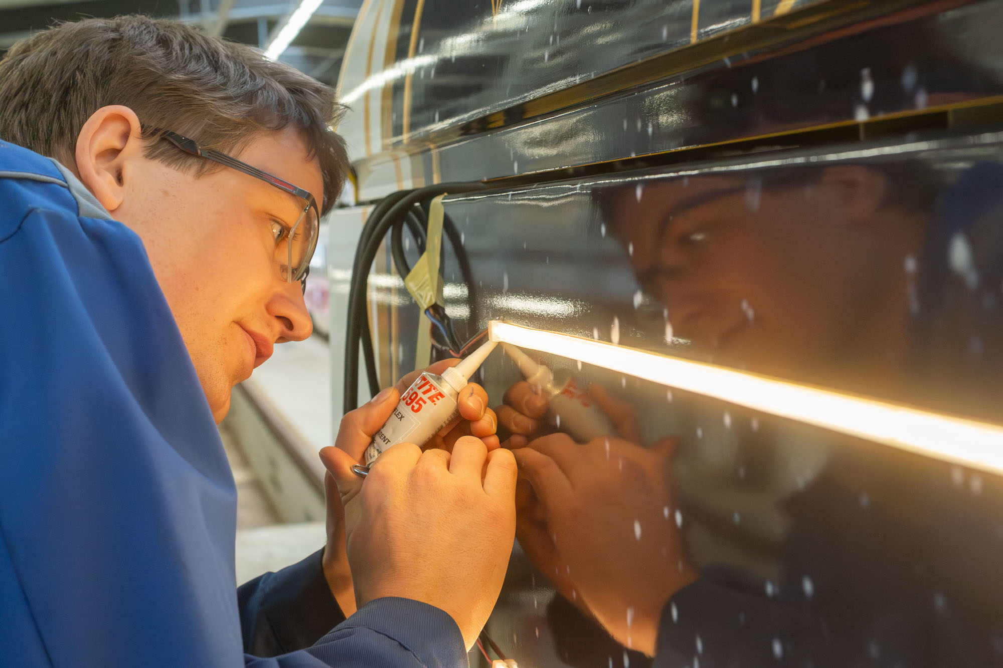 Die Besonderheit gegenüber allen anderen Wagen sind leuchtende LED-Streifen entlang der Dachkante. Das fällt in der dunklen Jahreszeit besonders auf. Insgesamt wurden 80 Meter LED-Streifen außen am Fahrzeug verbaut. „Eine zusätzliche Beleuchtung so einzubauen und anzuschließen, dass sie den Vorgaben von Betriebsleiter und Behörden entspricht, stellte sich als besonders knifflig heraus. Hier gebührt den Technikern der Straßenbahnwerkstatt ein besonderes Lob für ihre Kreativität“, sagte Gawalek.