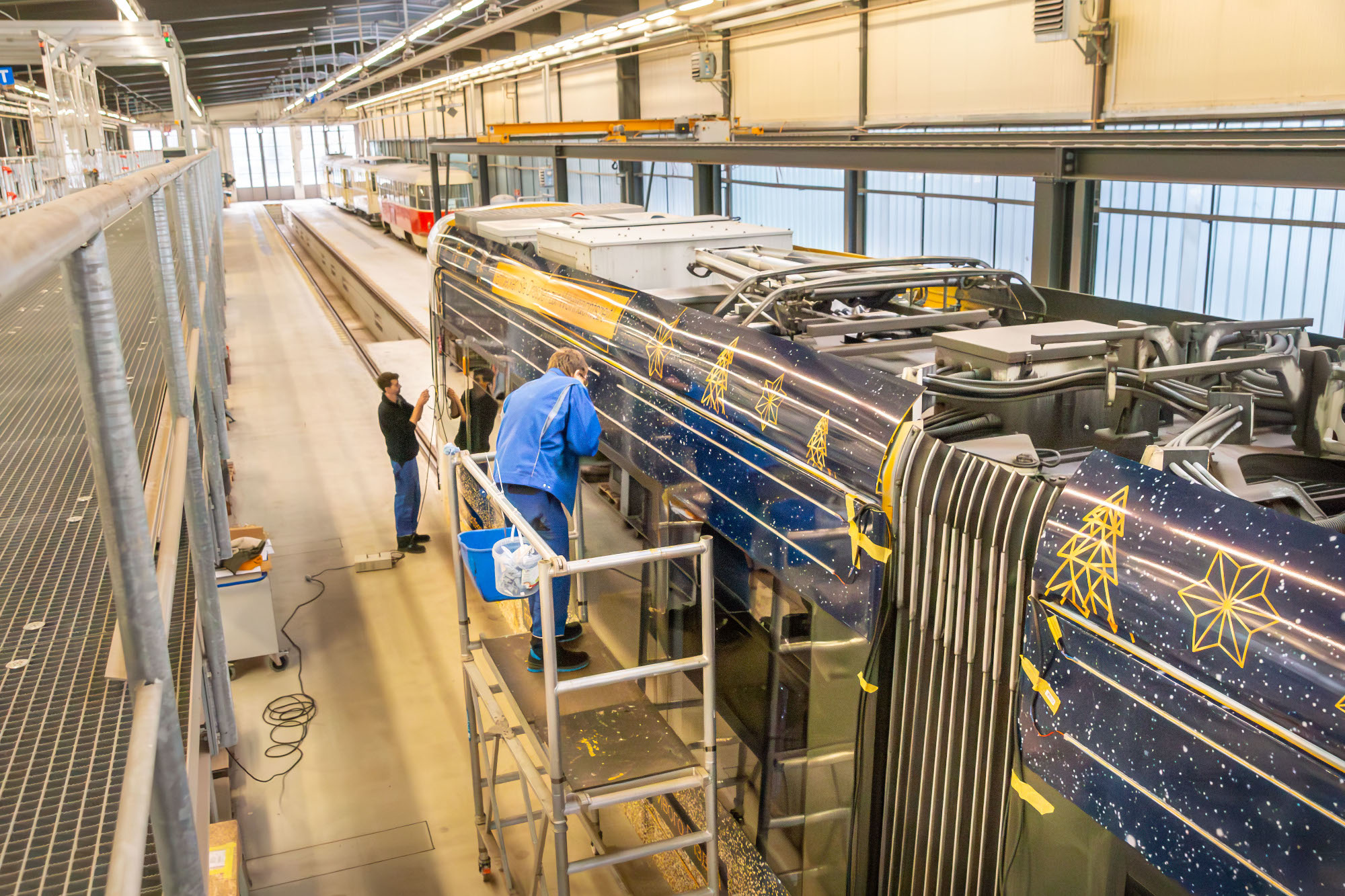 In den zurückliegenden Tagen bekam die Straßenbahn eine weihnachtliche Beklebung mit dunkelblauer Grundfarbe und goldenen Motiven. „Unsere Mitarbeiterinnen und Mitarbeiter in der Grafikabteilung haben sich gemeinsam mit der Dresden Marketing GmbH (DMG) Gedanken gemacht und eine Gestaltung gefunden, die nicht aufdringlich ist und sogar internationales Flair versprüht“, beschreibt DVB-Marketingleiter Martin Gawalek die Entstehung der „Weihnachtsstraßenbahn“.