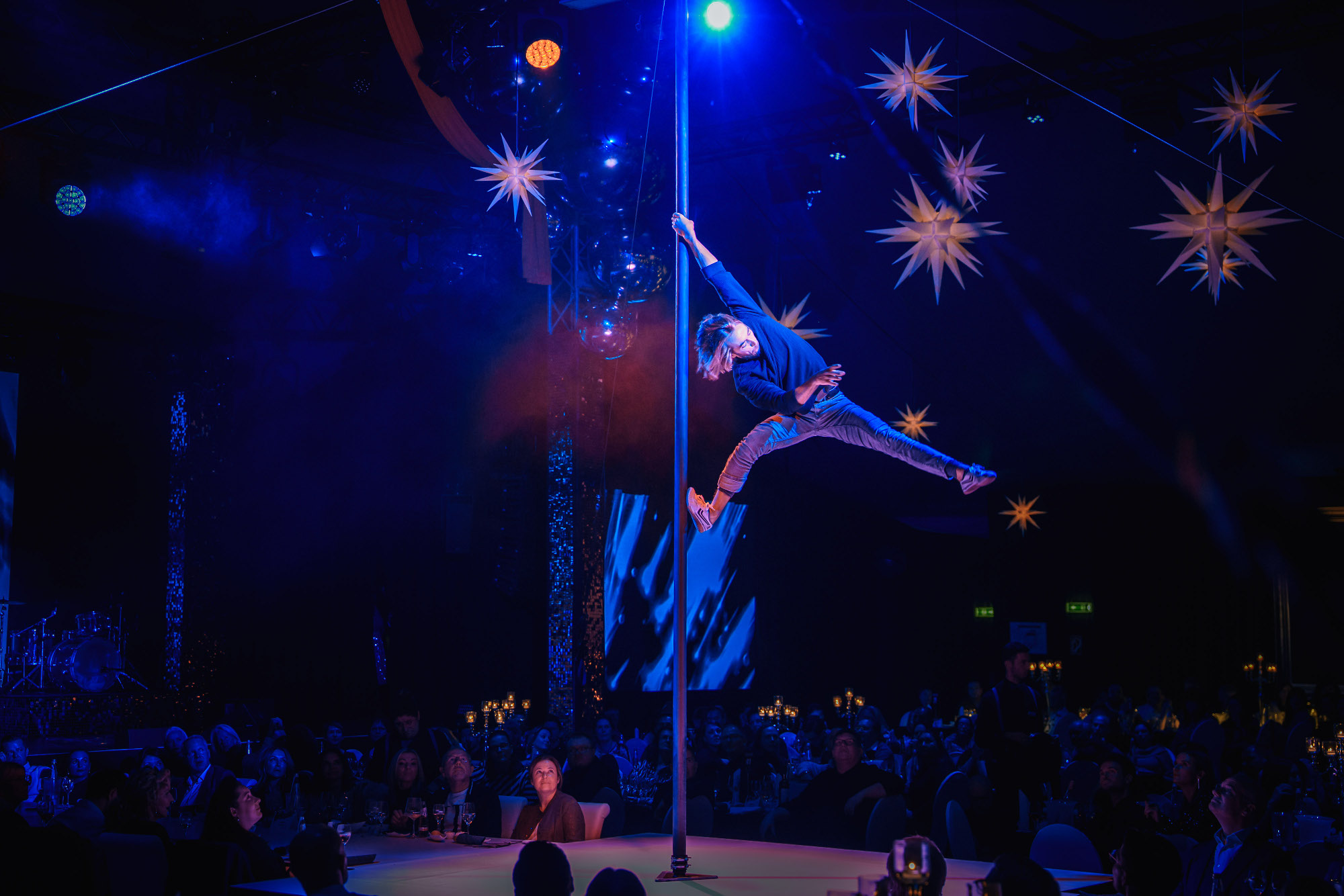 Das andere sind „Moments“. Bei der neuen Dinnershow-Premiere am vergangenen Wochenende sind ebenfalls Musiker und Artisten am Werk, beide Genres erstklassig. Selbstverständlich gibt es ein Menü – schließlich ist der Abend lang. Allerdings: Von der Länge merkt man bei „Moments“ nichts. Zackig geht es von Nummer zu Nummer.