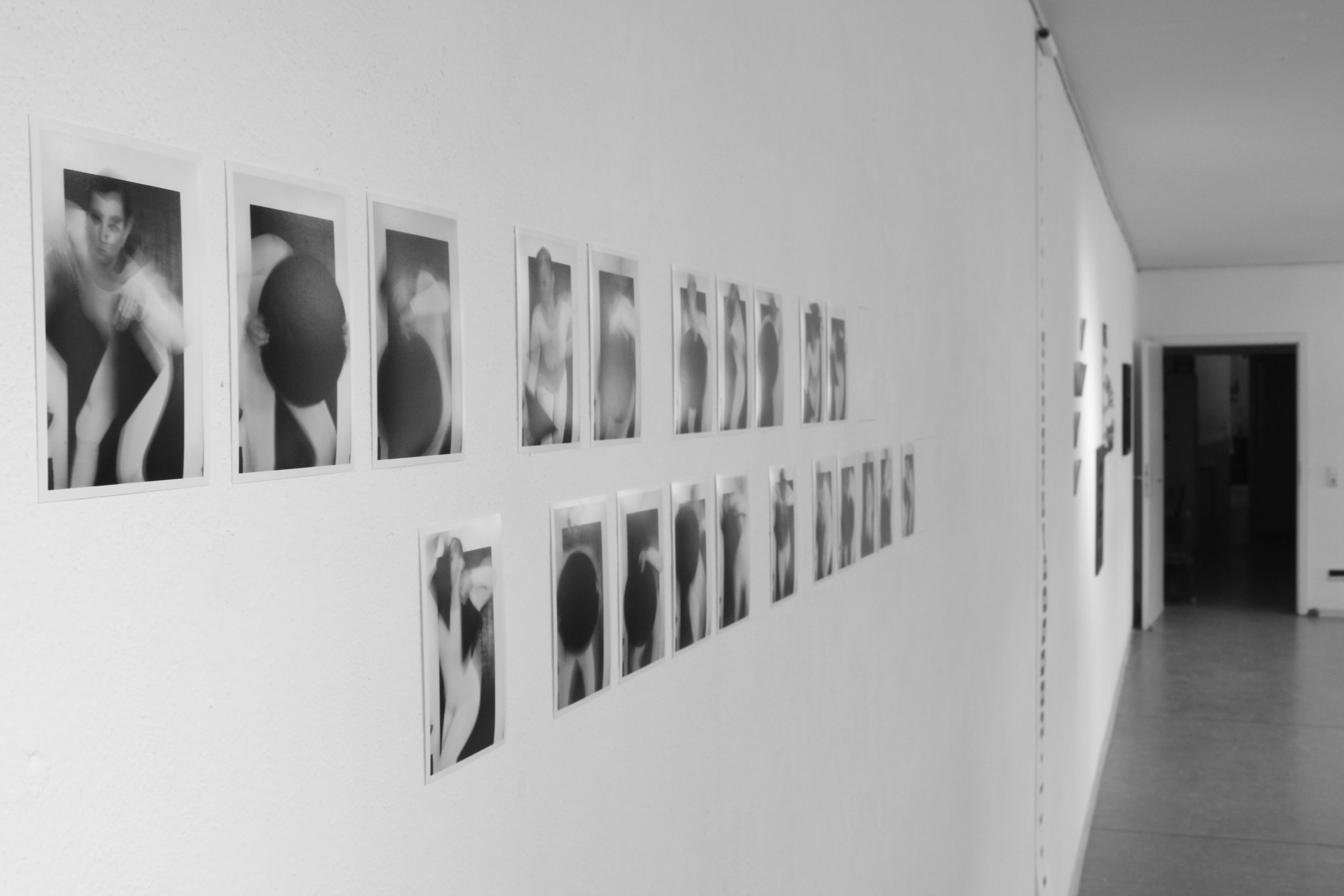 Ebenso in der Fotoserie „Lust-Unlust – eine getanzte fotografische Überlegung…“. Hierbei handelt es sich um eine Intervallaufnahme. Auf Grund der Kameraeinstellung, dem weißen Body, den die Künstlerin hier trägt und den geometrischen Formen, die sie benutzt, vermischen sich Körperbewegung und Raum. Dadurch wird der Körper selbst zum Raum. Die Fotografien sind dabei so angebracht, dass sie das Tänzerische aufgreifen, indem sie einen Takt angeben und diesen wieder brechen. Die Abstände der einzelnen Fotografien zueinander beziehen sich dabei auf die Abstände der Frames einer Animationsrolle, die gleich daneben von oben herunterhängt.
