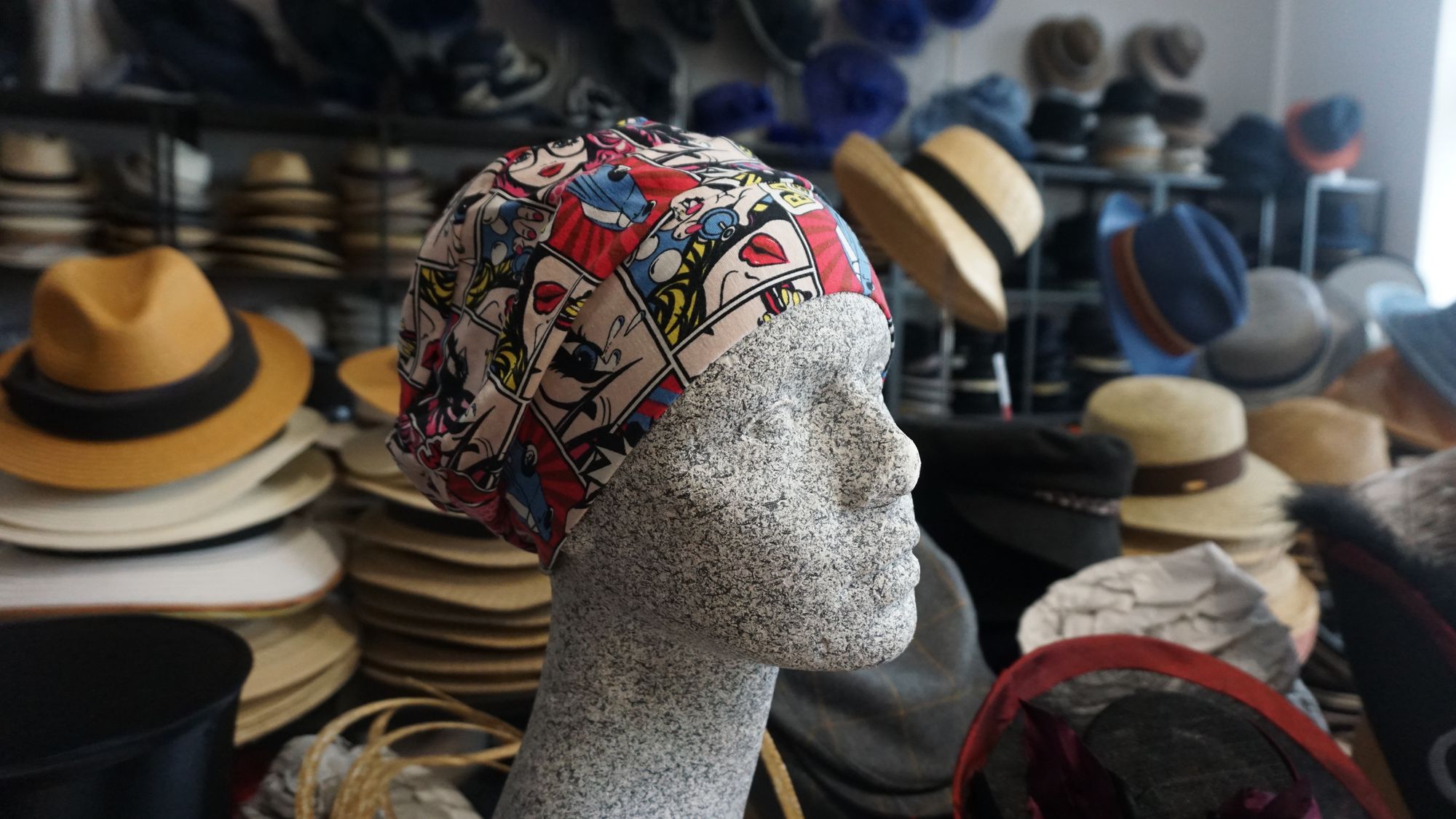 Das tut sie zum Beispiel anhand von Auftragsarbeiten von Leuten, die für einen bestimmten Anlass eine Kopfbedeckung suchen. Neben deren Vorstellungen fließen auch die Stoffe ein, die sie mitbringen: so kann der Streifen eines Kleides, das gekürzt werden musste, oder der Stoff, der für den maßgeschneiderten Anzug übrig war, als Hutband oder Mützenmaterial eine neue Bestimmung finden und nebenbei perfekt mit dem Outfit harmonieren.