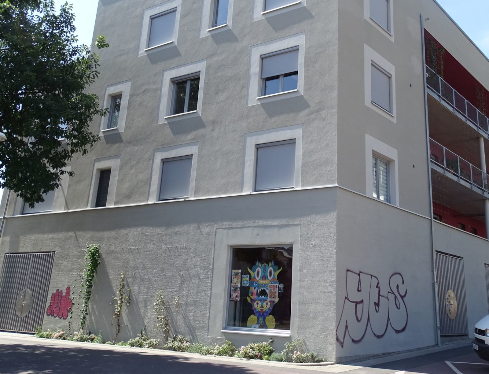Vorangegangen war eine längere Diskussion in der Eigentümergemeinschaft, die das Haus 2021 bis 2022 errichtet hat. „Was tun mit den Graffitis, die schon kurz nach der Fertigstellung auf der Fassade zu finden waren“, lautete die Frage. Verschiedene Ideen, auch das Übermalen, waren im Gespräch. Während der Schriftzug „Voice“ noch mit einem künstlerischen Anspruch daherkommt, fällt es schwer, dies auch anderen Graffitis an der Hauswand zuzugestehen. Und die sollen dann auch noch in ein neues Gesamtkunstwerk eingebunden werden? Genau davon hat Henning Haupt die Eigentümergemeinschaft mit seinen Entwurfsskizzen überzeugt. Man kennt sich gut. Er ist in eine der Wohnungen als Mieter eingezogen.