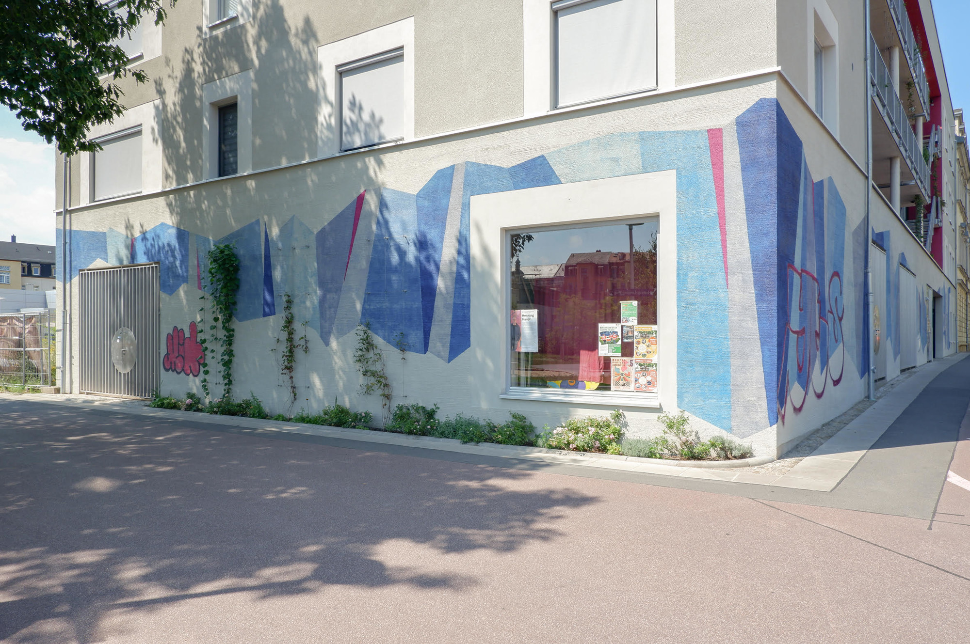 “Die Wandmalerei für die Fassade in der Rosa-Steinhart-Straße besteht hauptsächlich aus durchscheinenden Farben. Sie erstreckt sich über die gesamte Erdgeschossfassade und reicht bis zur Gesimskante“, erläutert Haupt sein Werk. „Ich finde es spannend, wie in der Verbindung von Malerei und Graffiti, der Street Art, eine vom Prozess der Entstehung bestimmte kollektive Malerei den Stadtraum verändert“.