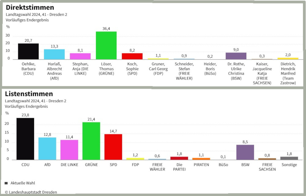 Landtagswahl 2024: Ergebnisse im Wahlkreis 41, Dresden 2. Quelle: Landeshauptstadt Dresden