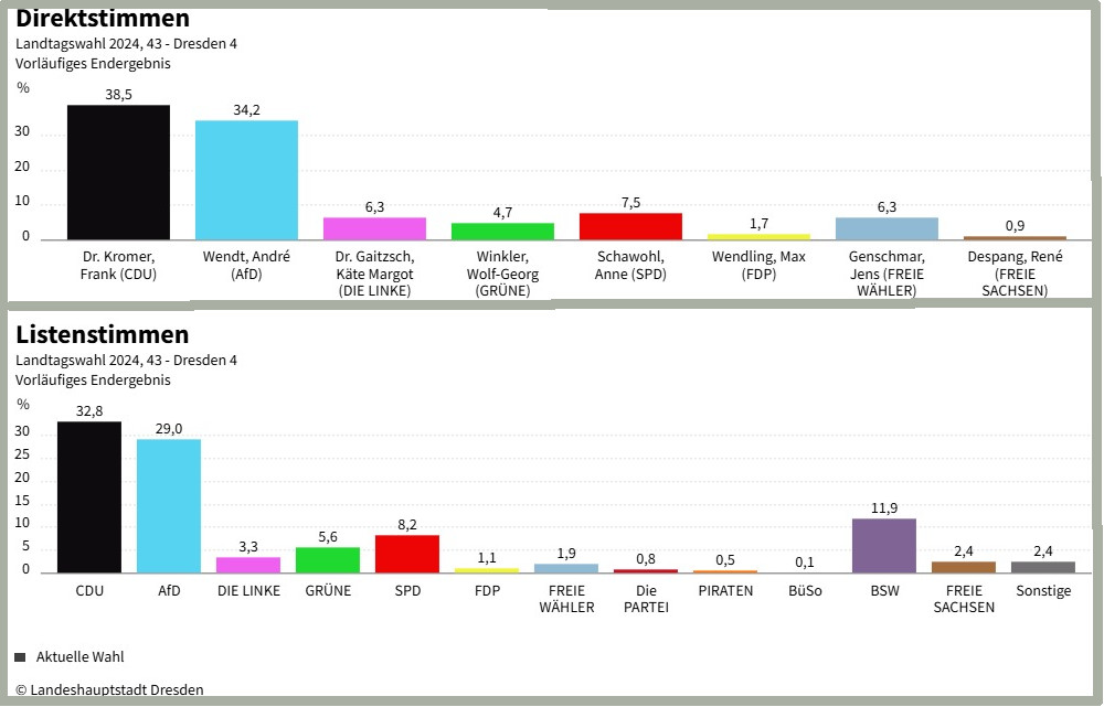 Landtagswahl 2024: Ergebnisse im Wahlkreis 43, Dresden 4. Quelle: Landeshauptstadt Dresden