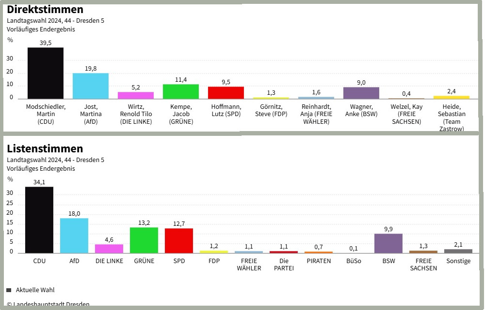 Mit 81,3 Prozent war im Wahlkreis Dresden 5 die Wahlbeteiligung am höchsten. Stadtweit lag sie bei 77,4 Prozent. Martin Modschiedler gewann seinen Wahlkreis mit dem größten Vorsprung aller Direktkandidaten. Rund 20 Prozent liegt er vor der Zweitplatzierten Martina Jost, AfD.