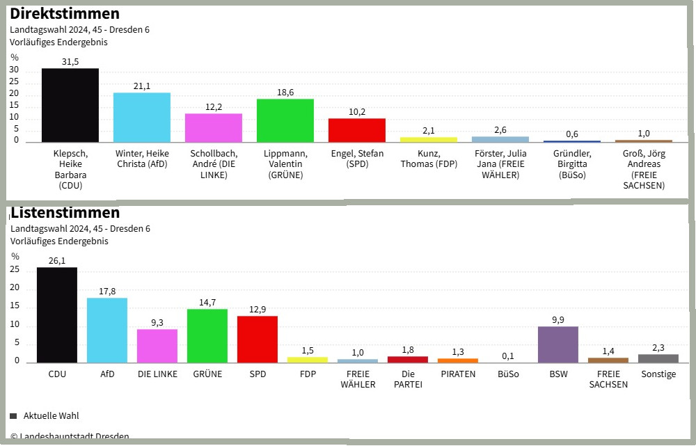 Landtagswahl 2024: Ergebnisse im Wahlkreis 45, Dresden 6. Quelle: Landeshauptstadt Dresden