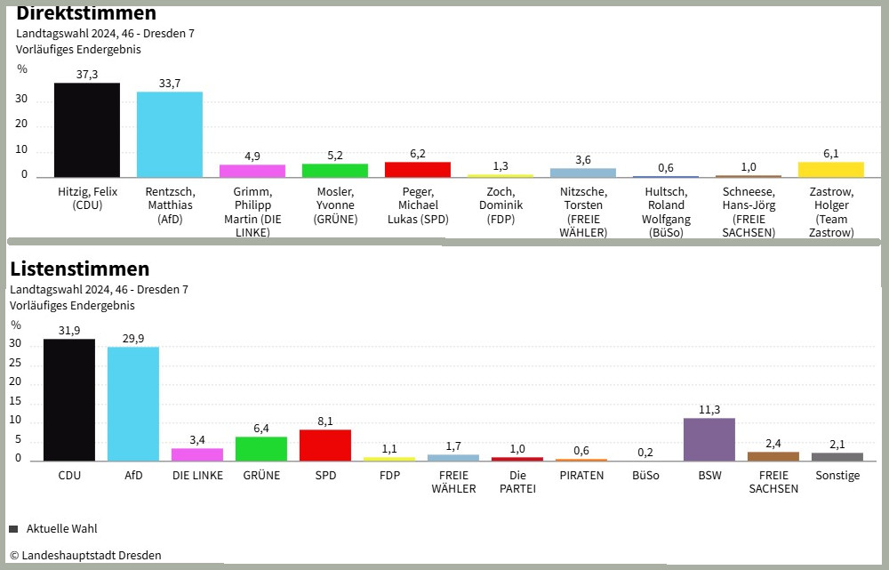 Landtagswahl 2024: Ergebnisse im Wahlkreis 46, Dresden 7. Quelle: Landeshauptstadt Dresden
