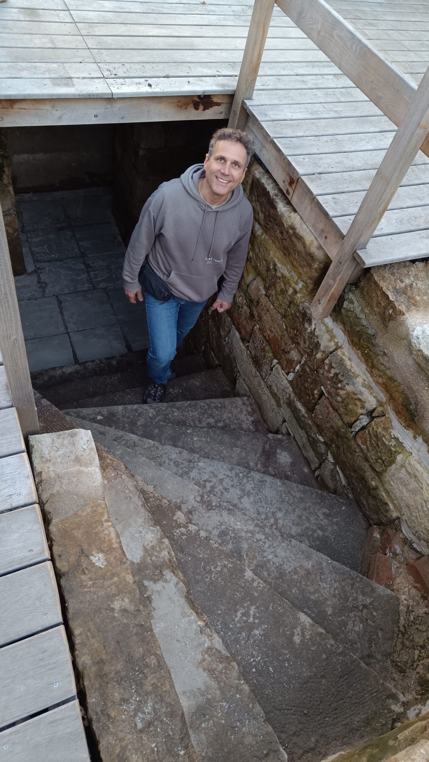 Im Holzlager stehen Hölzer in verschiedenen Größen bereit. Oßwald: „Unter fachlicher Anleitung dürfen die Kids hier frei bauen – Türme, Buden, Hollywoodschaukeln“. Die von den Kindern zu errichtenden Konstruktionen können erst nach Einweihung des Spielplatzes entstehen. Daher ist das Areal derzeit noch recht unbelebt. Eine Rutsche liegt im Gras, der bald gut besuchte Sandkasten ist noch abgedeckt. Eine Steintreppe führt in einen unterirdischen Raum. Oßwald erklärt: „Das war mal ein Keller, den wir unbedingt als Teil des Spielplatzes behalten wollten. Auch hier dürfen die Kids bauen und spielen“.