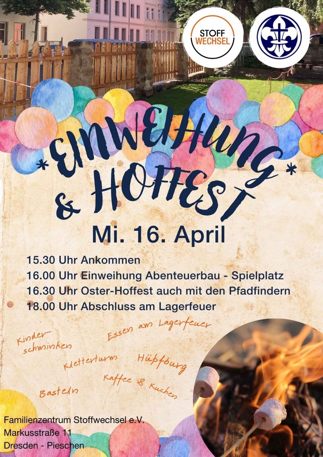 Die feierliche Einweihung des Spielplatzes am 16. April erfolgt in Verbindung mit einem Oster-Hoffest. Der Stoffwechsel e.V. lädt hierzu alle interessierten Kinder, Jugendlichen und Eltern ein. Der Eintritt ist kostenfrei.