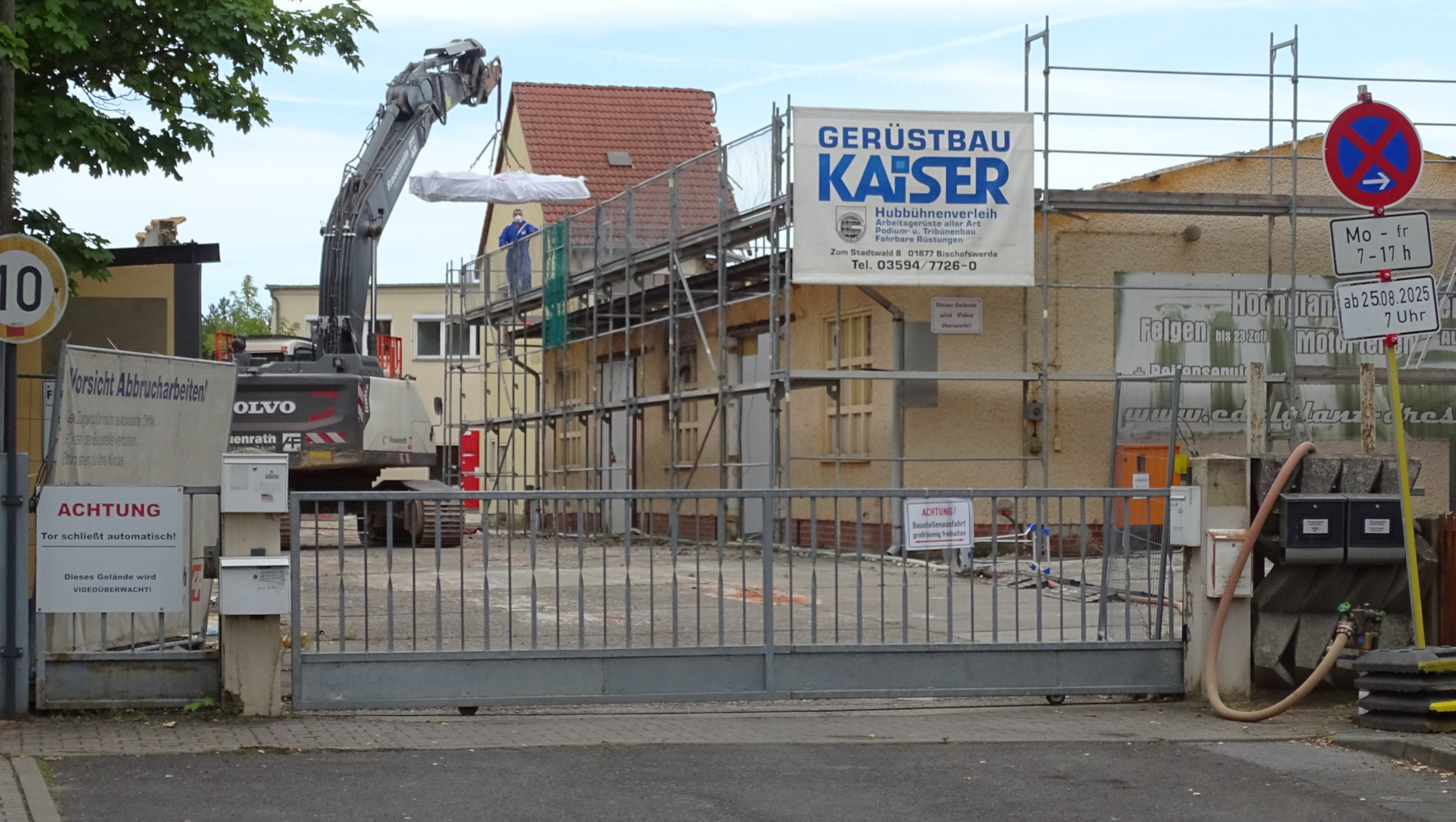Indessen laufen die Abrissarbeiten auf dem Areal, wo bis zum Sommer noch Maler, Elektriker, Klempner, Kfz-Schlosser oder auch ein Folientechniker ihre Werkstätten hatten. An einem der Gebäude ist noch die Aufschrift zu erkennen: „Produktionsgenossenschaft Handwerk. Aufbau. Erbaut 1958“.