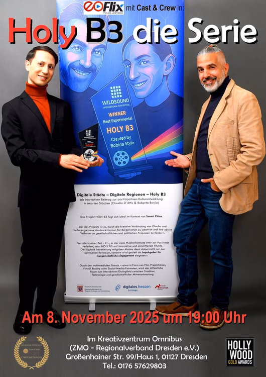 Am 8. November findet im Kreativzentrum Omnibus in Dresden-Pieschen ein Kurzfilmabend statt. Gezeigt wird der Film „Holy B3“, ein künstlerisches Projekt, das den Zusammenhang zwischen Glaube, Medien und digitaler Identität im 21. Jahrhundert thematisiert. Gezeigt werden mehrere Kurzfilme der preisgekrönten Serie „Holy B3“ – ausgezeichnet unter anderem bei den Hollywood Gold Awards und dem Terra di Siena International Film Festival. Nach der Vorführung gibt es Gelegenheit zum Gespräch mit den beiden Filmregisseuren Claudio D’Attis und Roberto Basile, zum Netzwerken und zum Austausch über die Entstehung des Projekts.