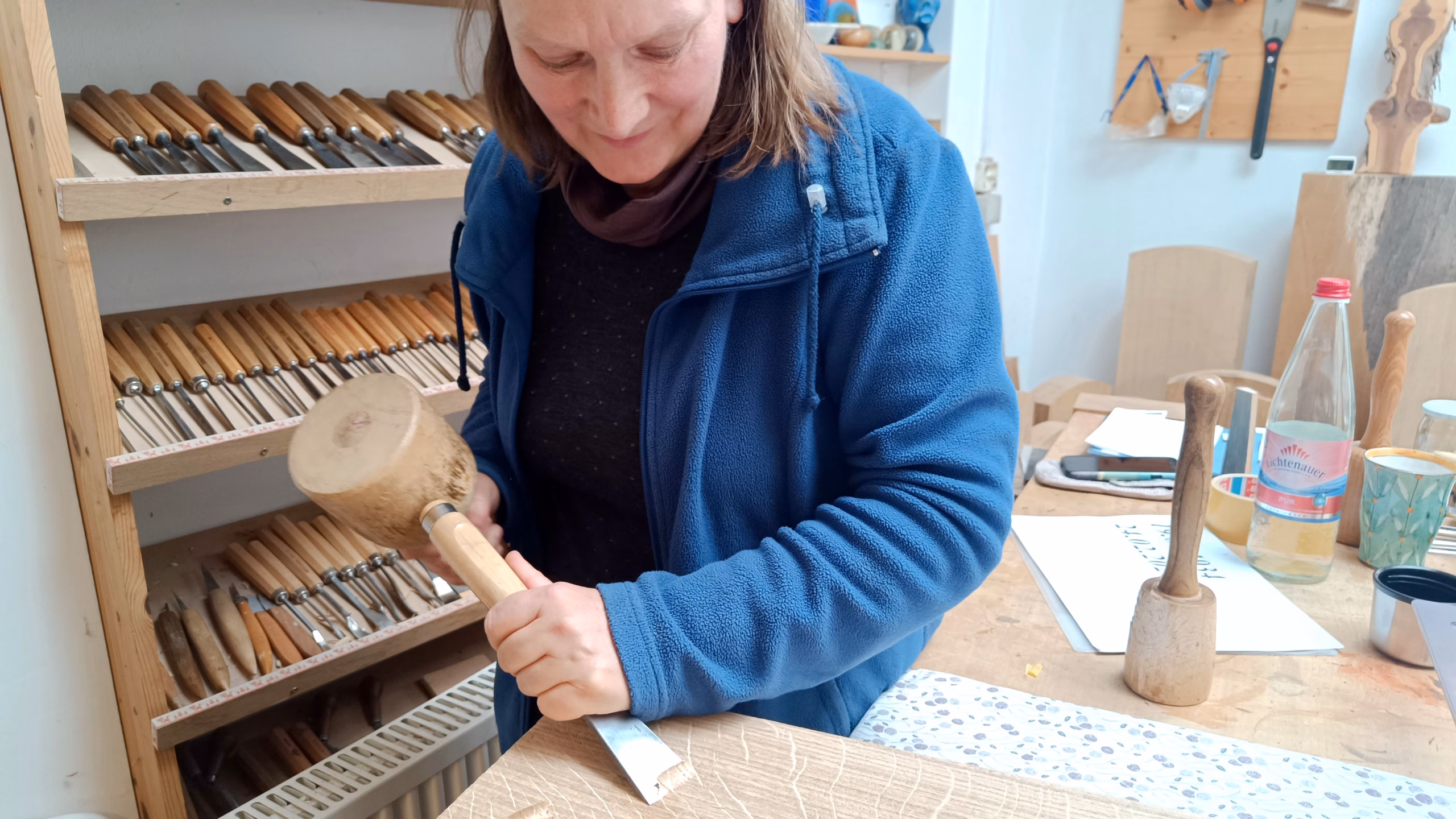 Drinnen liegt ein warmer Duft von Holz und frischem Melissentee in der Luft. Auf schweren Werkbänken aus Metall und Holz ruht eine Bleistiftskizze: eine Grabstele, über die sich Schwalben erheben, leicht und in Bewegung, als würden sie sich gerade in den Wind heben. Auf dem Boden verstreut liegen grobe Späne – Spuren der Arbeit, die Ellger mit kräftigen Schnitzeisen aus dem Material herausgelöst hat. Die Werkzeuge selbst hängen ordentlich sortiert an einer Seite der Werkstatt, jederzeit griffbereit.