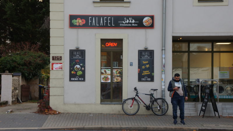 Seit einem Jahr führt Ahmad Alkabbani das kleine Falafel-Bistro am Trachenberger Platz. Zehn Stunden täglich, außer Sonntag, steht er hinter