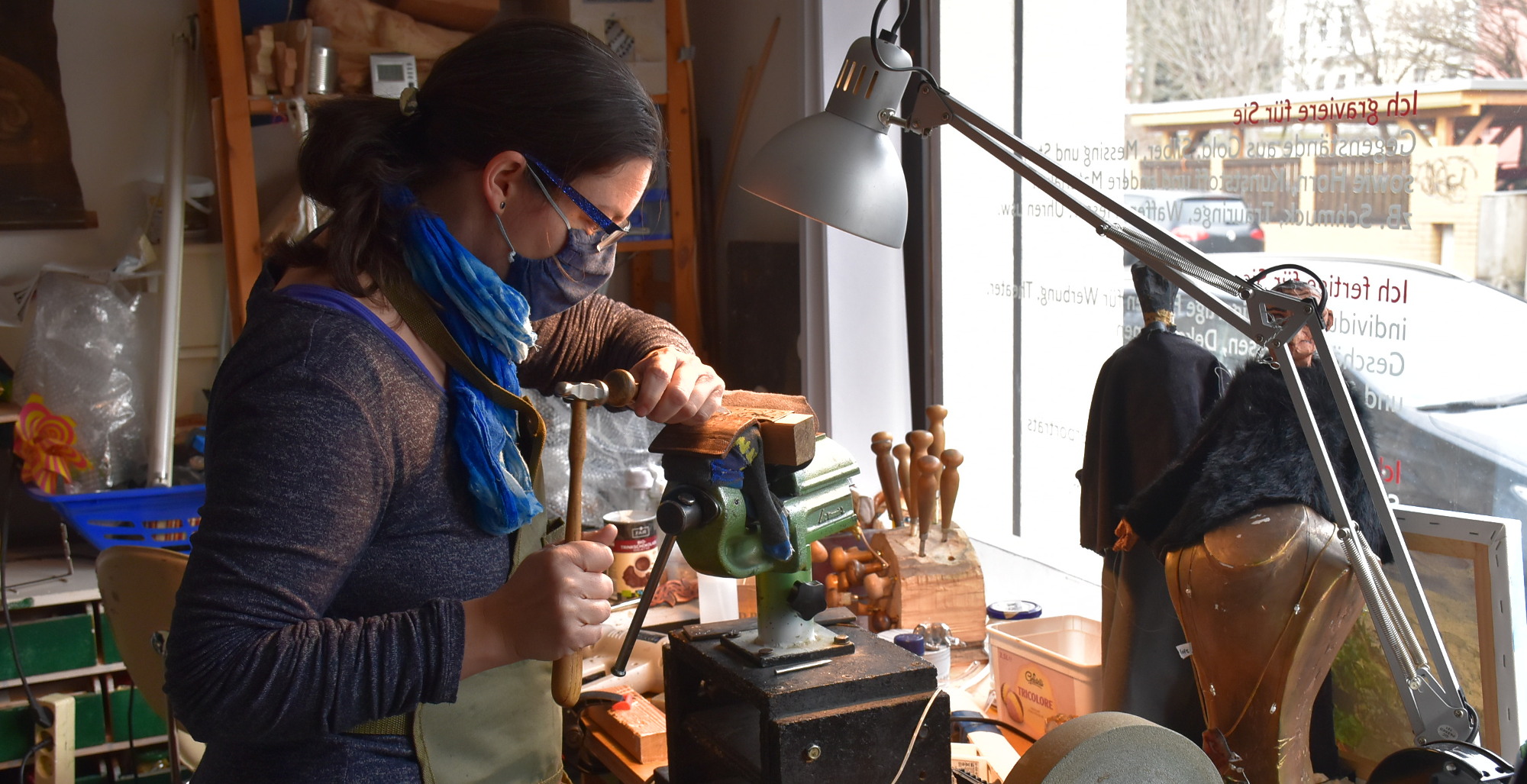 Wenn Anne Földi in ihrer Werkstatt an der Döbelner Straße mit Hammer und Meißel eine Gravur fertigt, schauen auch immer