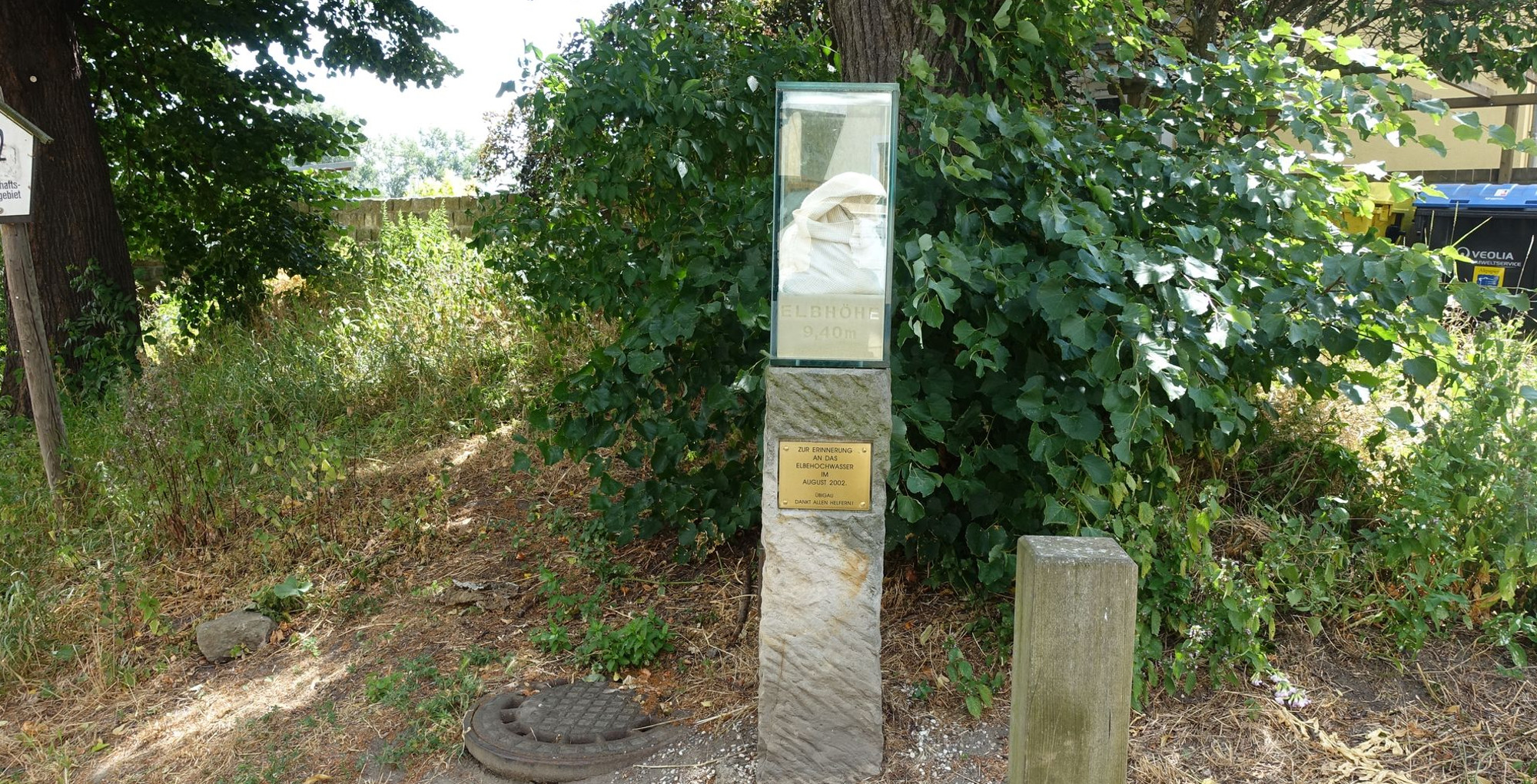 Die Hochwassersäule in Altübigau glänzt wie neu. Sie zeigt den Stand der Elbe im Jahr 2002 – 9,40 Meter. Zwanzig