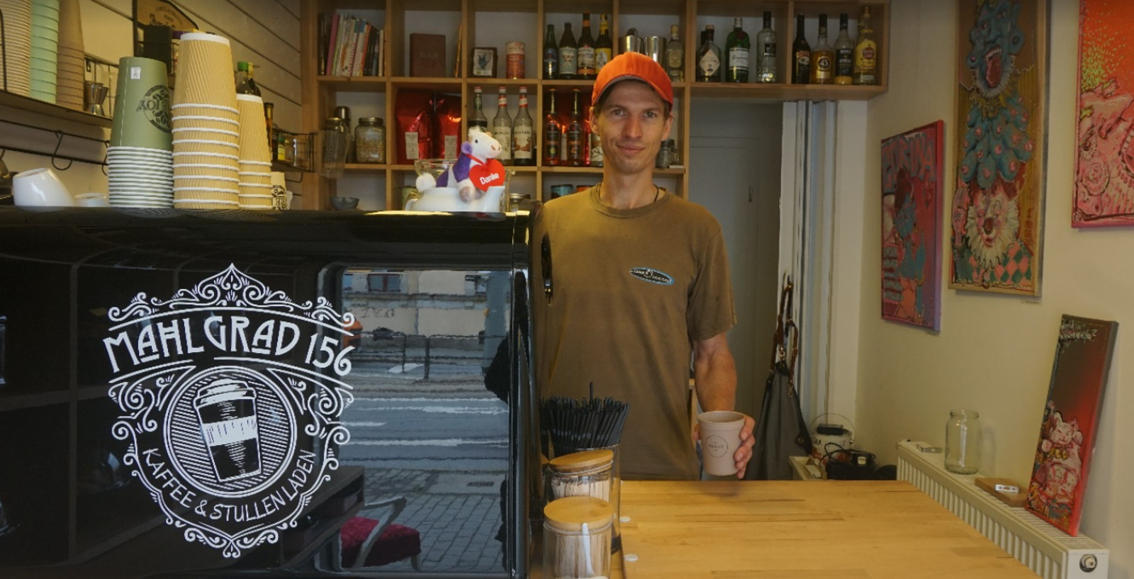 Als ich am Mahlgrad 156 ankomme, schraubt Inhaber Maik gerade an einem kleinen Außenstehtisch. Die Idee dazu sei erst heute