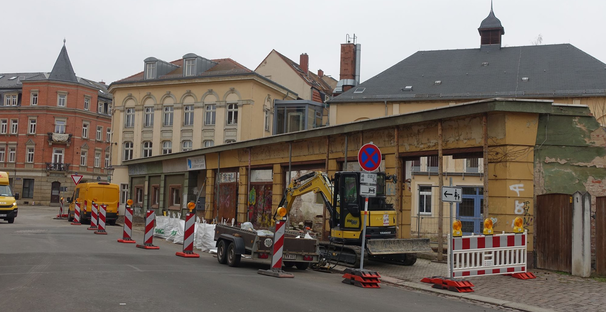 Am kommenden Montag beginnen an der „Musikschule Goldenes Lamm“ die Abrissarbeiten der noch stehenden Reste der alten Ladenpassage. Die Vorbereitungen